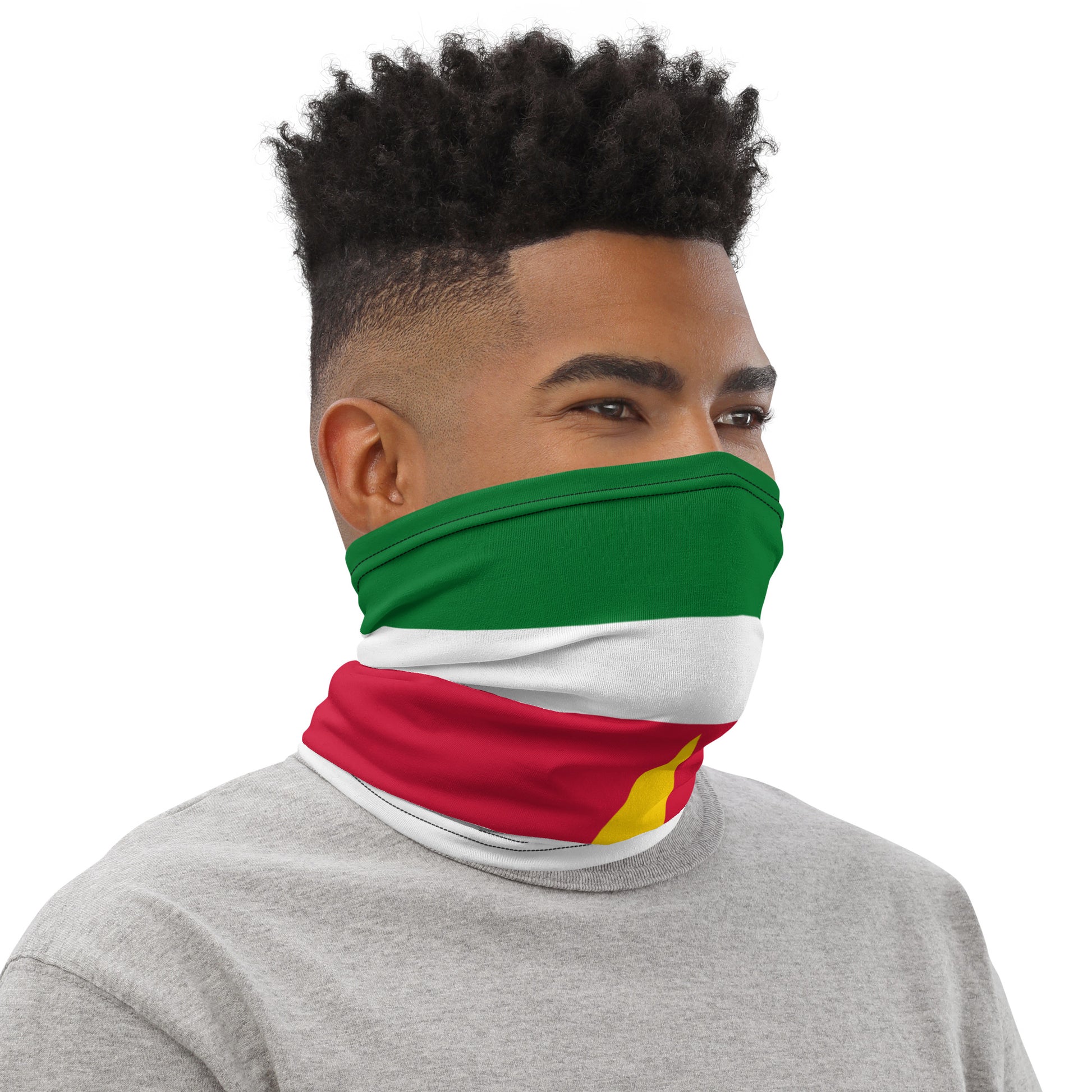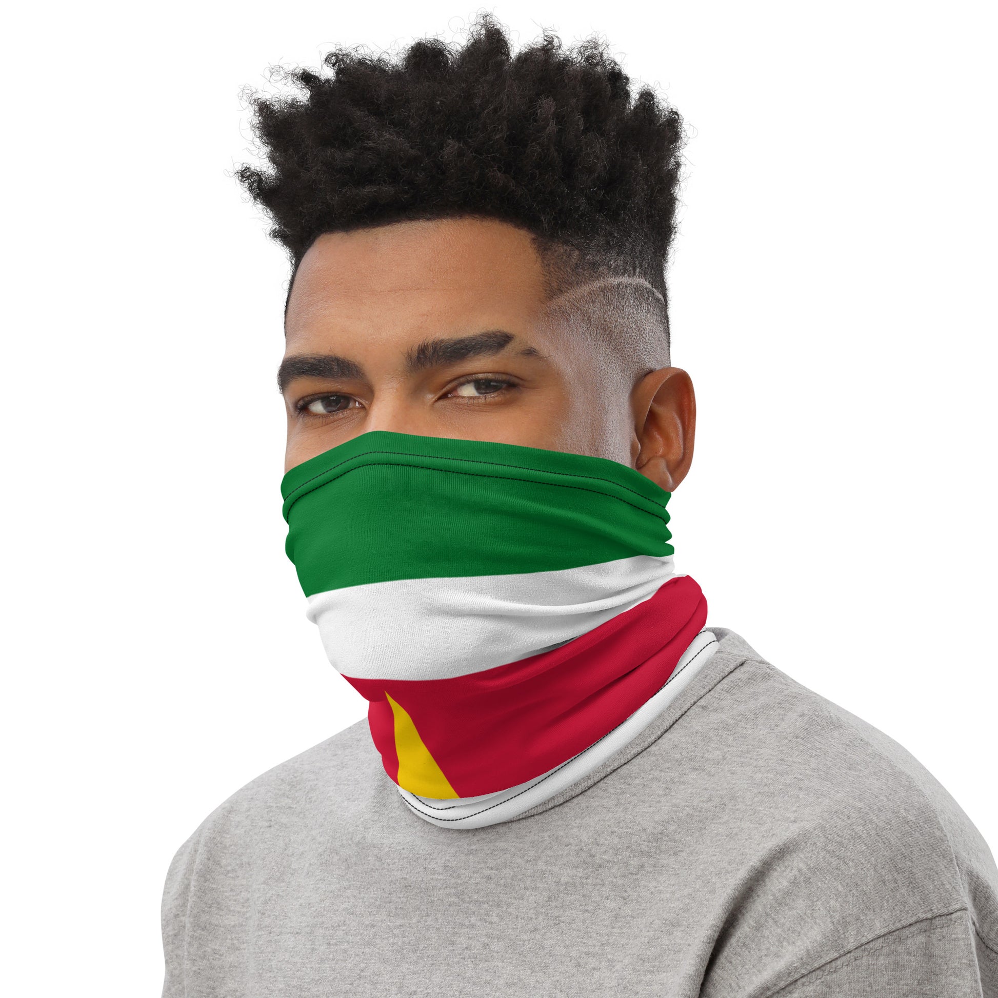 Represent Suriname with pride and style. This multi-functional Suriname flag neck gaiter can be worn as a face cover, headband, scarf, or bandana. Made from soft, breathable material, it's perfect for festivals, outdoor activities, or everyday wear. A versatile statement piece for anyone repping Suriname and the Caribbean.